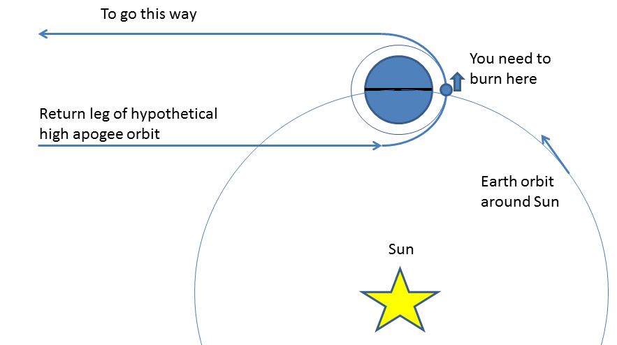 Edit 2: In the diagram above, assuming launch is soon, the Earth is viewed from forward along the Earth’s velocity and the antipode, the place for the burn, is opposite the shiny spot on the Equator.