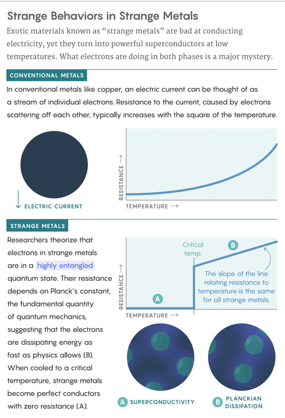 The behavior of the Strange Metal phase is being called evidence of a state of maximum entanglement between electrons. The electrons in the strange metal are dissipating their energy at the maximum possible rate allowable, defined in relation to Planck's constant.